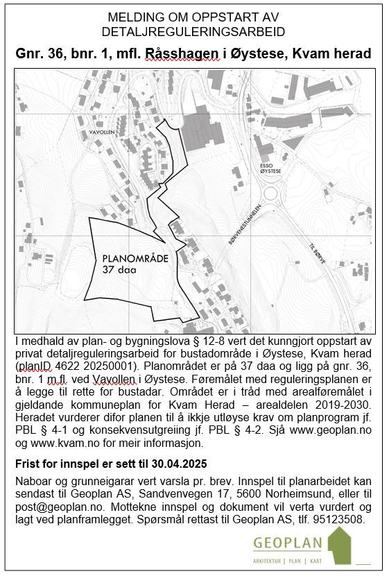 Kunngjering: Varsling av oppstart - Detaljreguleringsplan 20250001, Råsshagen, Øystese, Kvam herad